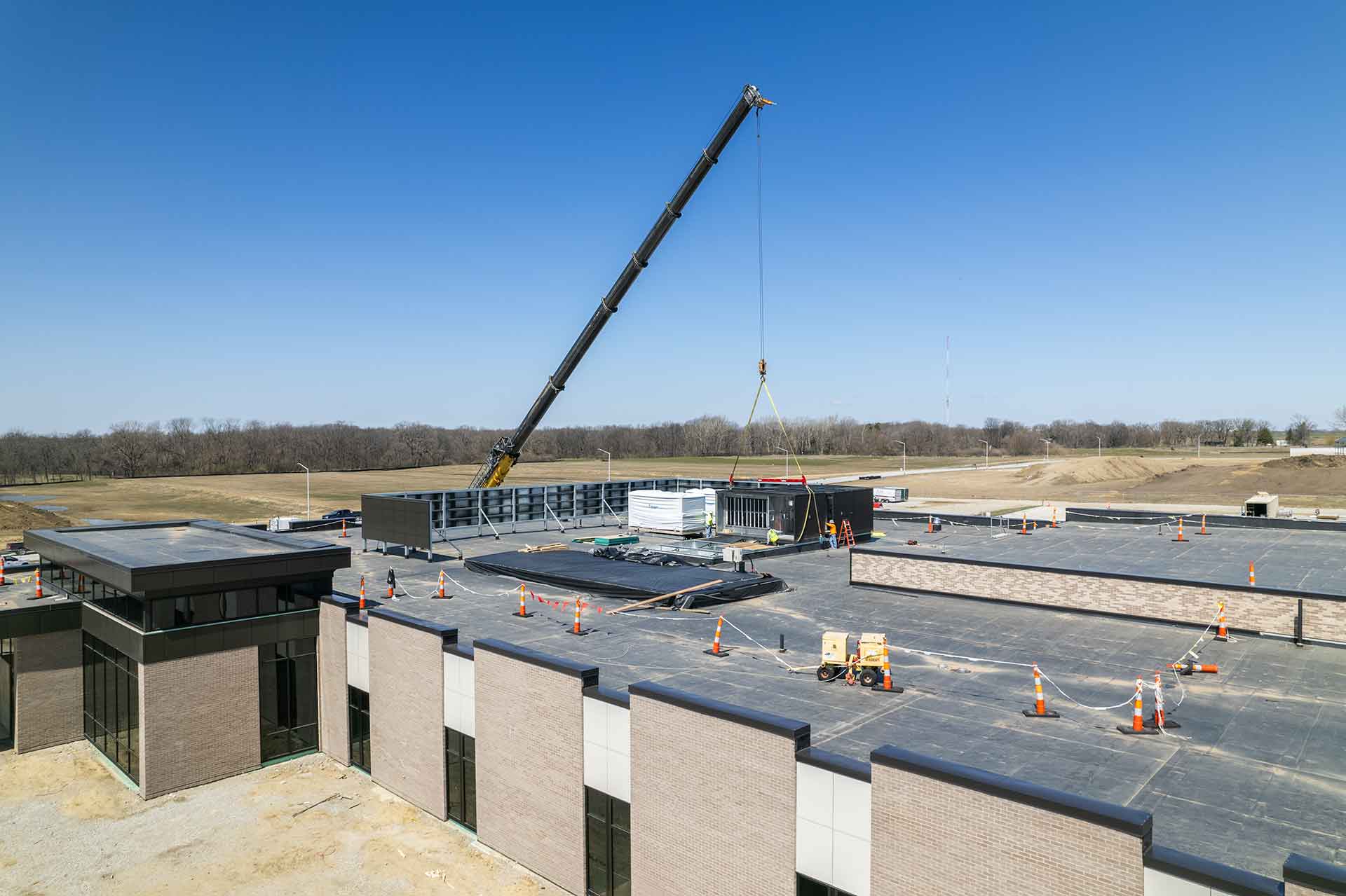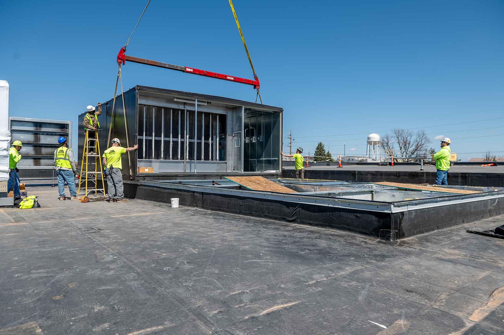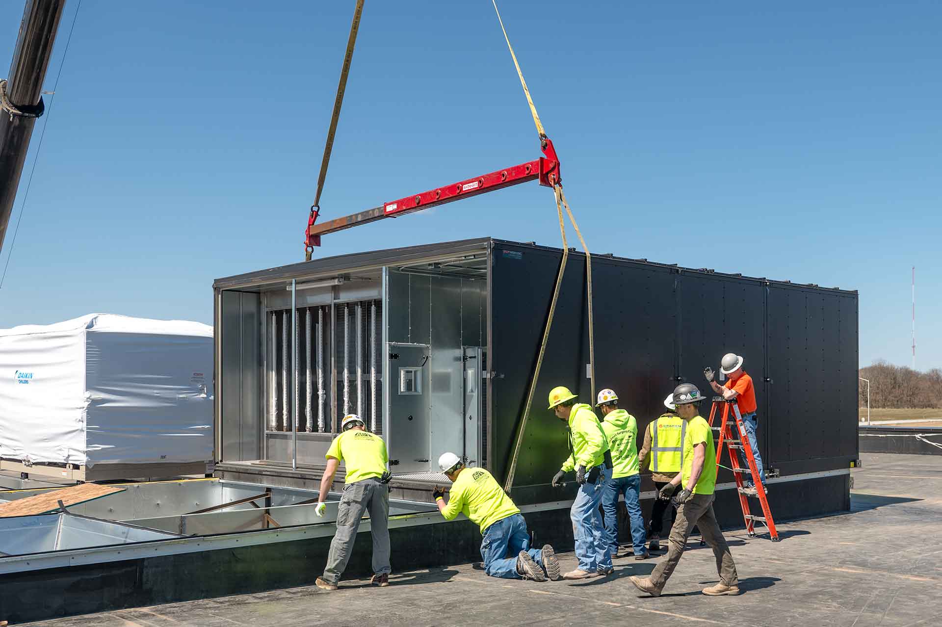The project team at Ames Surgery Center cranes AHU’s 1 & 2 to the roof of the new building