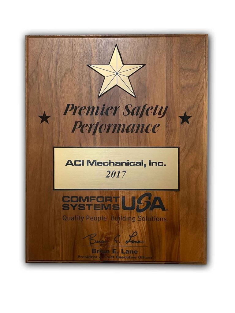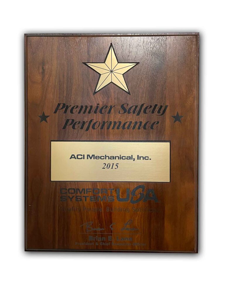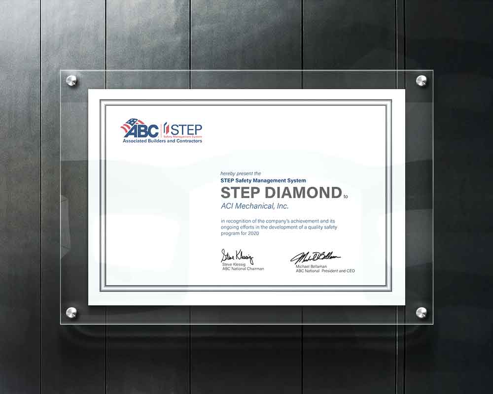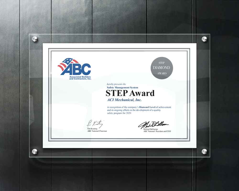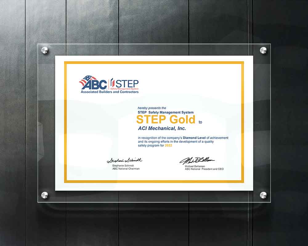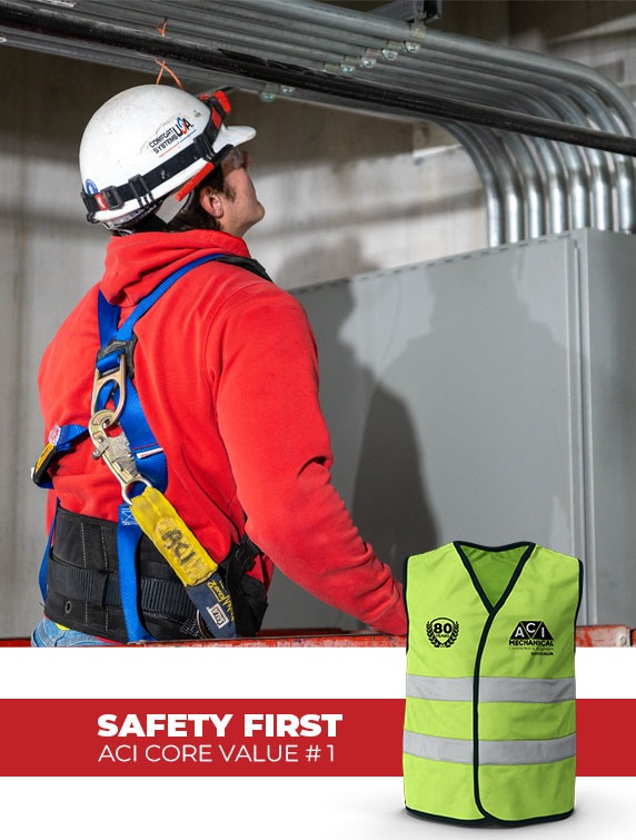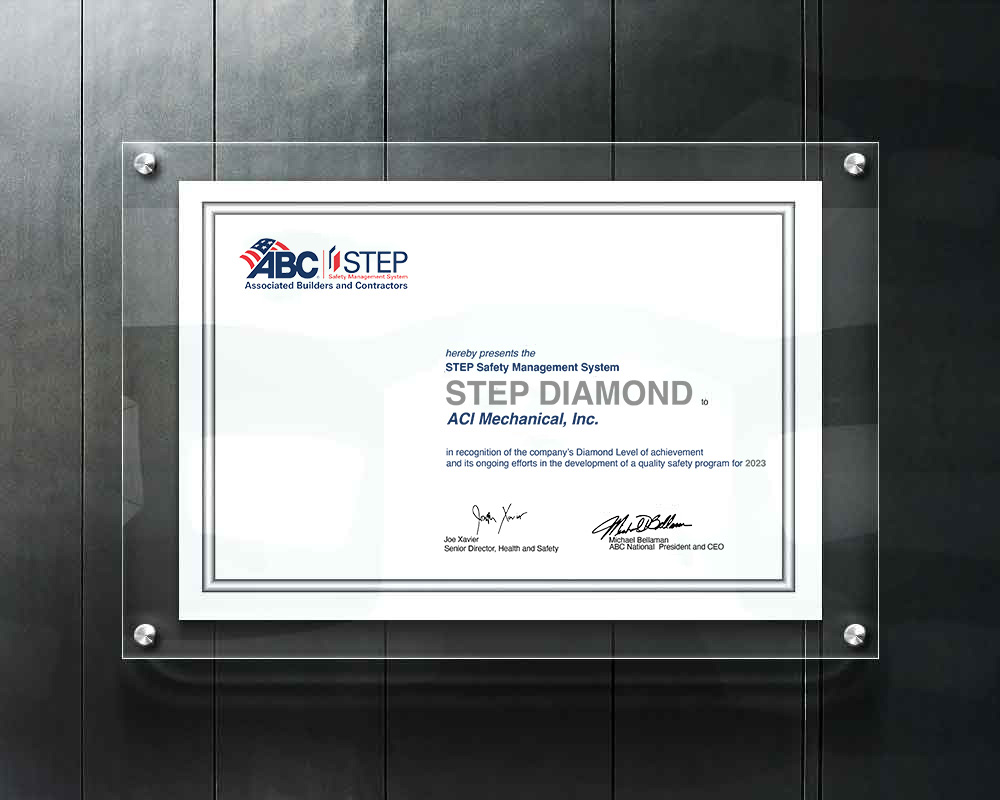 ACI Mechanical Inc, as part of Comfort Systems USA, has an exceptional pre-task/pre-job technique, “Think 5 x 5,” taught to all employees to ensure that they think and work safely at the point at which the work is taking place. Our “Think 5 x 5” safety initiative increases employee awareness and enhances the company culture to “Take 5 seconds and 5 steps back” to think about their surroundings and work area to ensure a safe work environment.