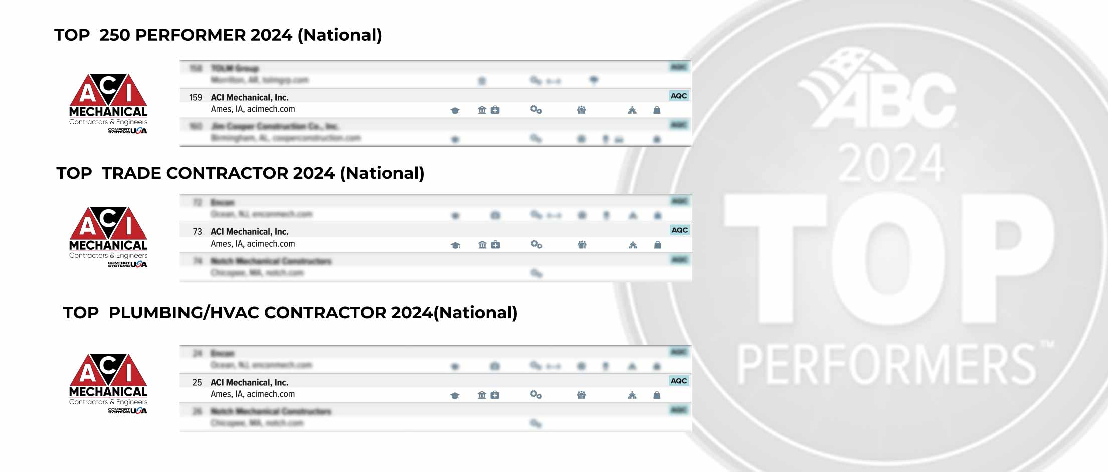 ABC’s Top Performers lists acknowledge the accomplishments of member contractors across various criteria such as safety, quality, diversity, and project excellence. These lists are ranked by work hours and include special designations.